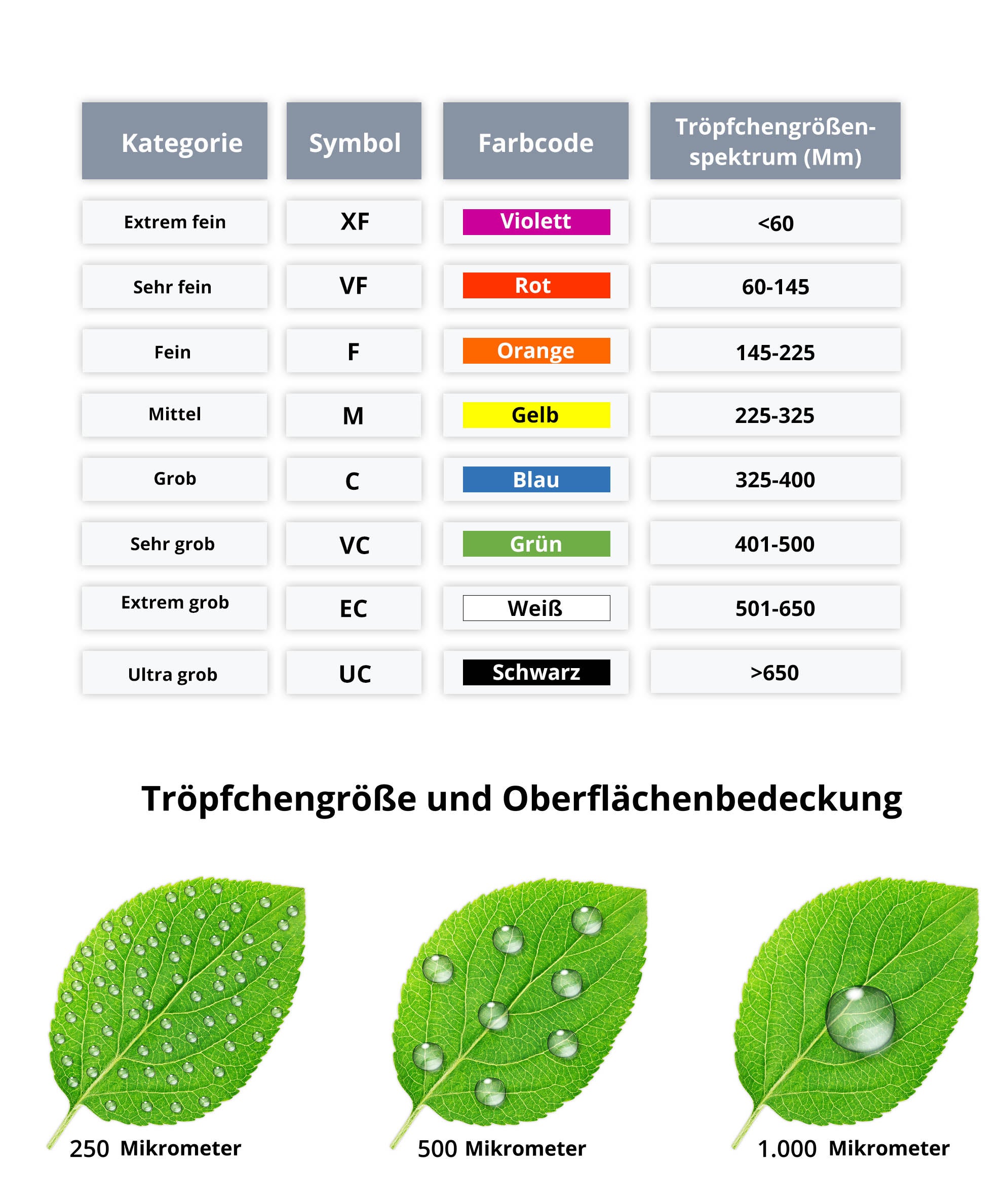 Die Mehrzahl der Pflanzenschutzdüsen kann entweder als fein-, mittel- oder grobtropfig klassifiziert werden. Eine Düse mit groben oder sehr groben Tröpfchen wird normalerweise gewählt, um die Abdrift des Sprühstrahls zu minimieren. Dahingegen wird eine Düse mit feinen Tröpfchen gewählt, um eine maximale Oberflächenbenetzung der Zielpflanze zu erreichen.