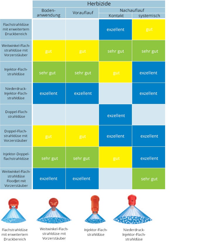 - Düsen, die extrem grobe Tröpfchen erzeugen, werden bevorzugt für systemische Herbizide und im Vorauflauf eingesetzt.