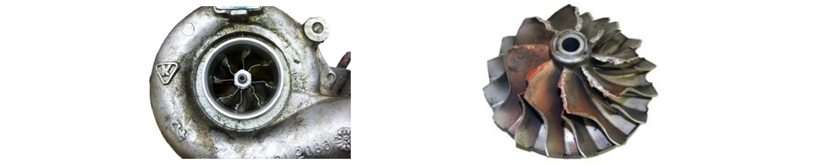 - Des fragments du moteur, comme des morceaux de soupapes, peuvent frapper la roue de la turbine, mais aussi un mauvais entretien du filtre à air peut permettre à des particules (de sable, de gravier et d'autres impuretés) d'entrer dans le turbo en frappant les hélices de la roue du compresseur.