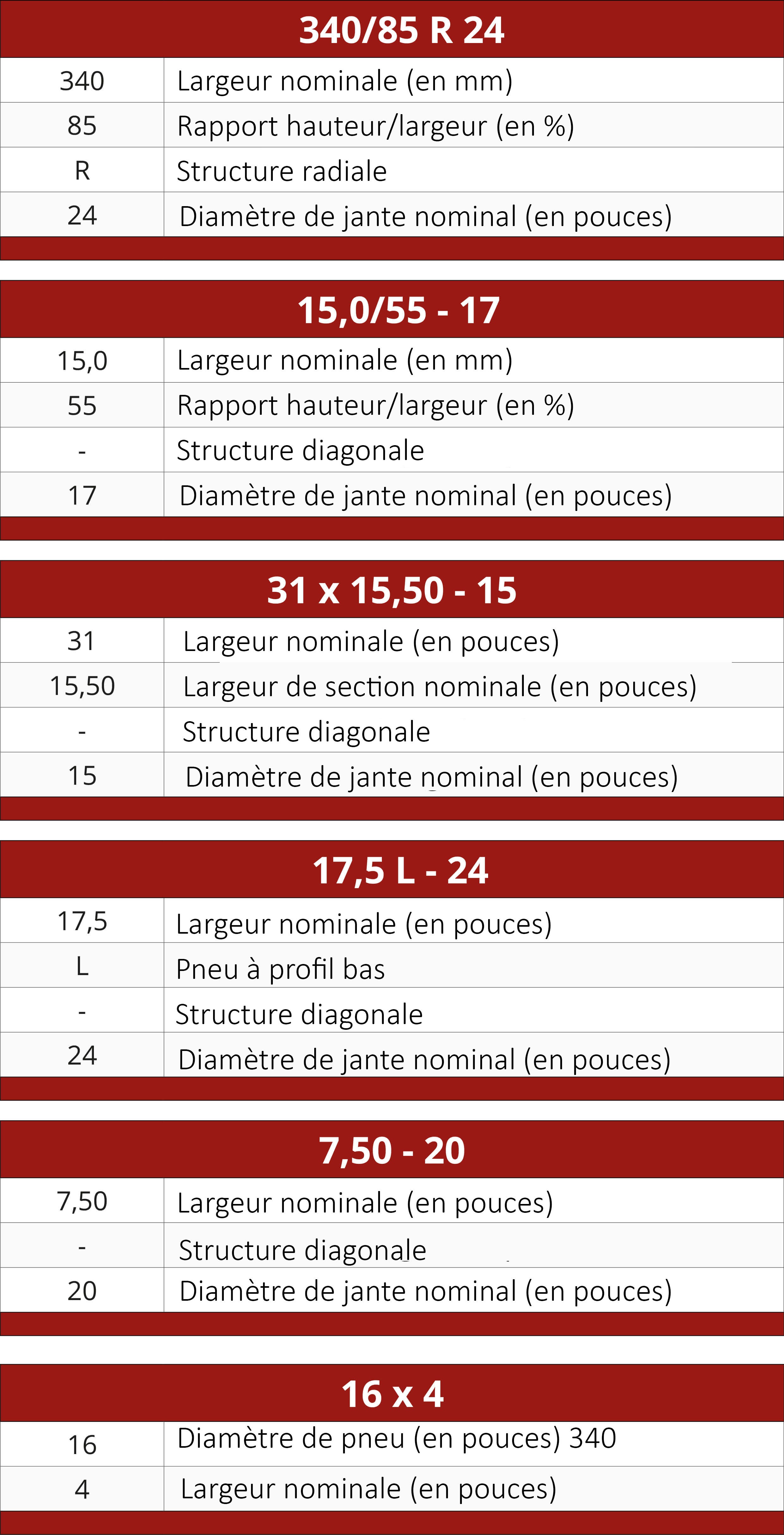 Différents marquages sont en usage pour indiquer les dimensions d’un pneu. Si ces dernières étaient auparavant surtout exprimées en pouces, il est aujourd’hui plus habituel d’utiliser une combinaison de pouces et de millimètres. Dans la pratique, les divers marquages sont cependant mélangés, en fonction de l’application et de la marque du pneu. Nous en expliquons ci-dessous les plus courants à l’aide de quelques exemples.