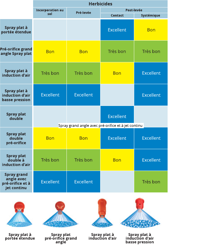 - Les buses qui produisent des gouttelettes extrêmes à ultra-grosses sont généralement utilisées pour les herbicides systémiques et les herbicides de pré-levée appliqués au sol tout en minimisant la dérive.