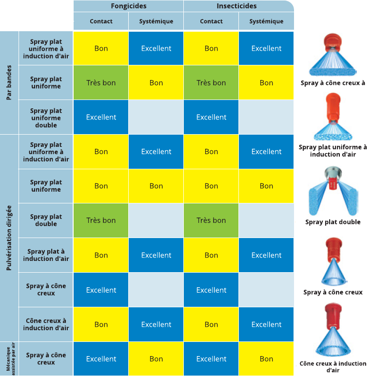 - Les buses produisant des gouttelettes de taille moyenne sont le plus souvent utilisées pour les herbicides, insecticides et fongicides systémiques à contact.