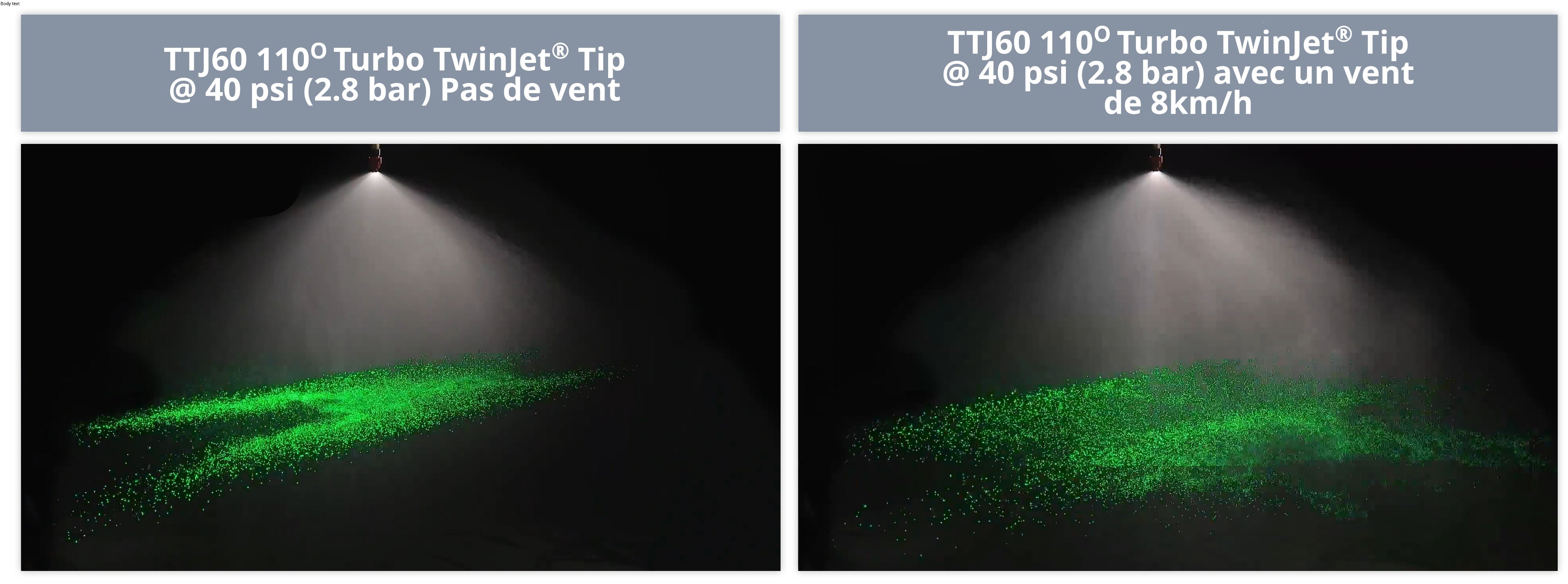 Avec la bonne buse TeeJet, il est possible de réduire la dérive de 90 %. Les buses à faible dérive sont classées en classes de réduction de la dérive de 50 %, 75 %, 90 % et 95 %. La dérive dépend du type de buse et de la pression utilisée avec la buse. En abaissant la pression, il est possible, dans certains cas, d'obtenir une plus grande réduction de la dérive avec la même buse. Exemple : la buse TeeJet TTI60 à 4,5 bars réduit la dérive de 50 %. La même buse à 2 bars réduit la dérive de 75 % et à 3 bars, de 90 %. Il n'est pas possible d'utiliser n'importe quelle buse dans toutes les situations.