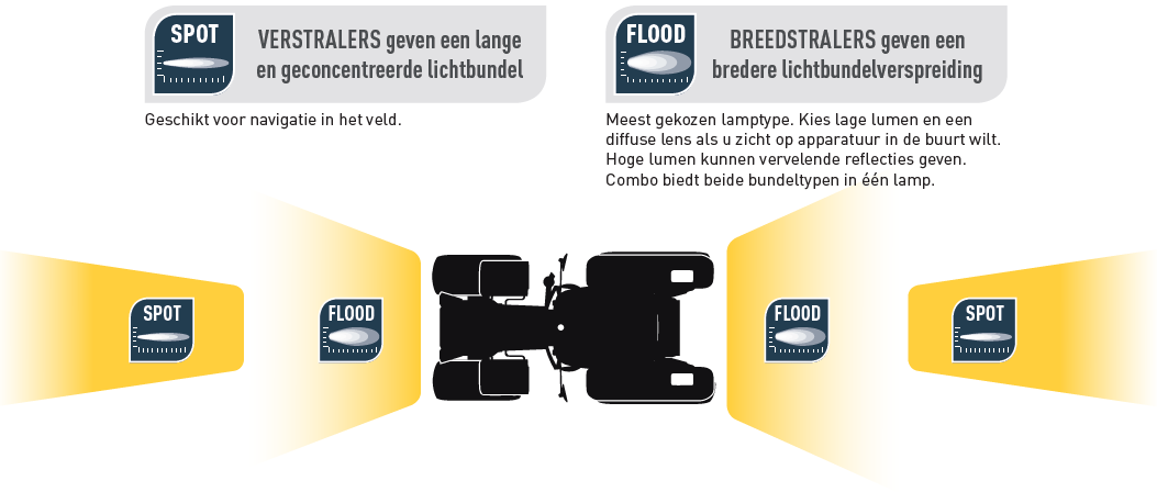 Nous sommes en plein milieu de la saison où le soir tombe tôt. L’éclairage approprié vous permet de poursuivre votre travail même quand il fait sombre tout en disposant d’une visibilité optimale. Quel phare de travail est le mieux adapté à votre travail ? Cela dépend de vos activités, de la zone à éclairer et de sa superficie. Ces différentes exigences vous permettent de déterminer le phare de travail qu'il vous faut. Mais lequel faut-il choisir : la version à large faisceau (Flood), à longue portée (Spot) ou la Combo ? Nous vous en disons plus ici à propos de leurs caractéristiques et domaines d’application de manière à disposer à tout moment de la bonne solution d’éclairage.