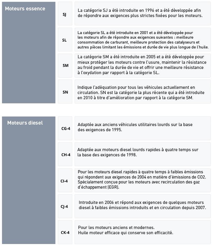 La spécification API indique la qualité et l’adéquation de l’huile et est représentée par deux lettres, la deuxième indiquant la qualité.