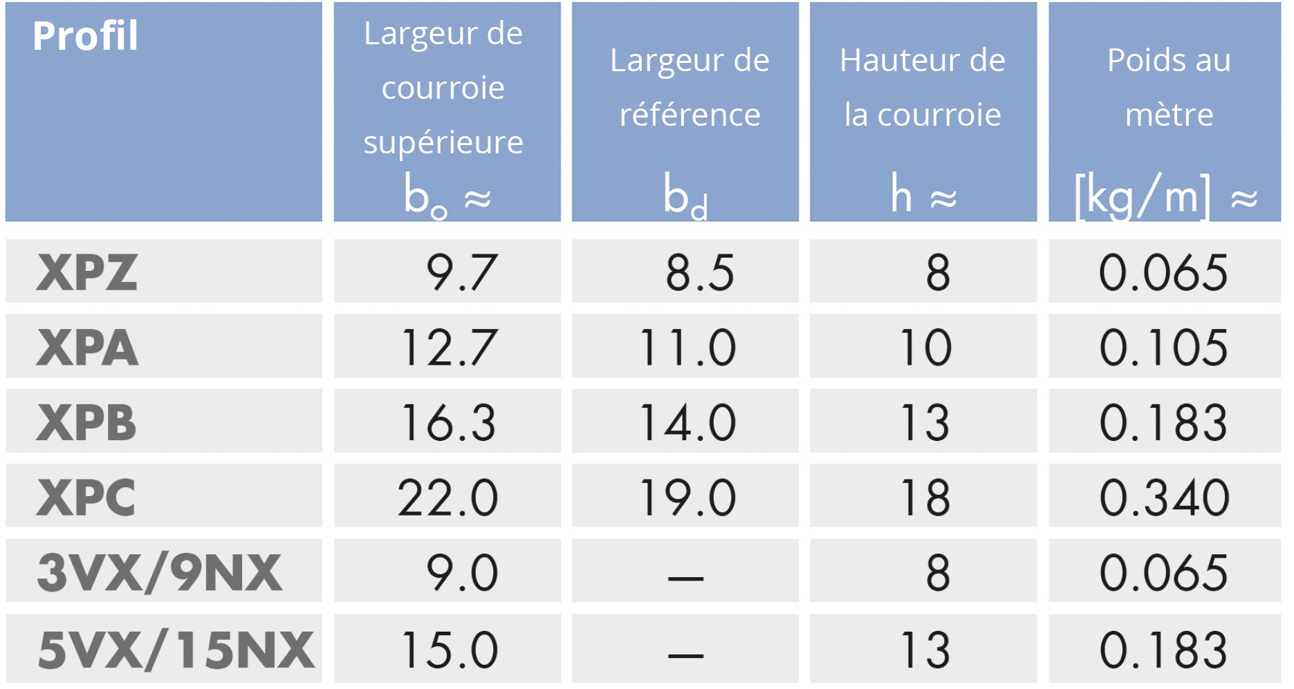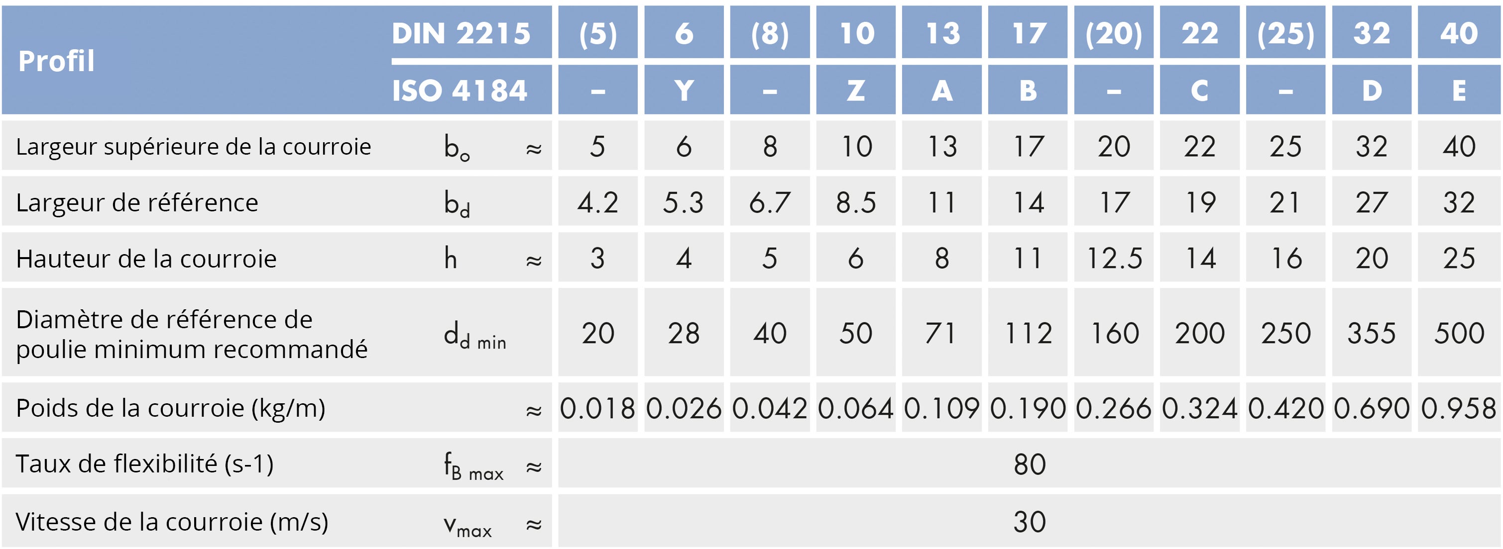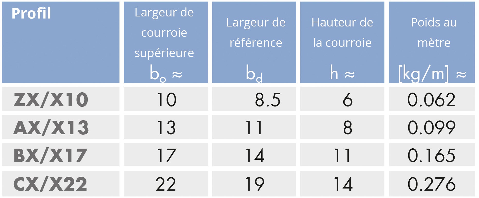 Vous pouvez identifier la bonne courroie trapézoïdale en vous référant au schéma et au tableau ci-dessous. Les sections transversales sont identifiées par la largeur supérieure et la profondeur.