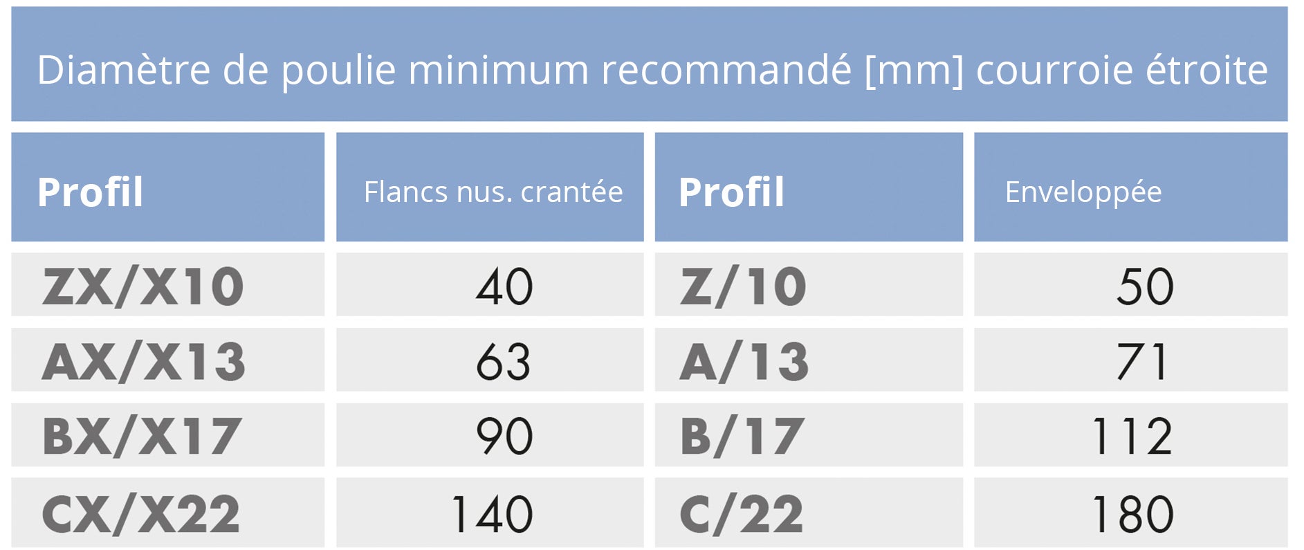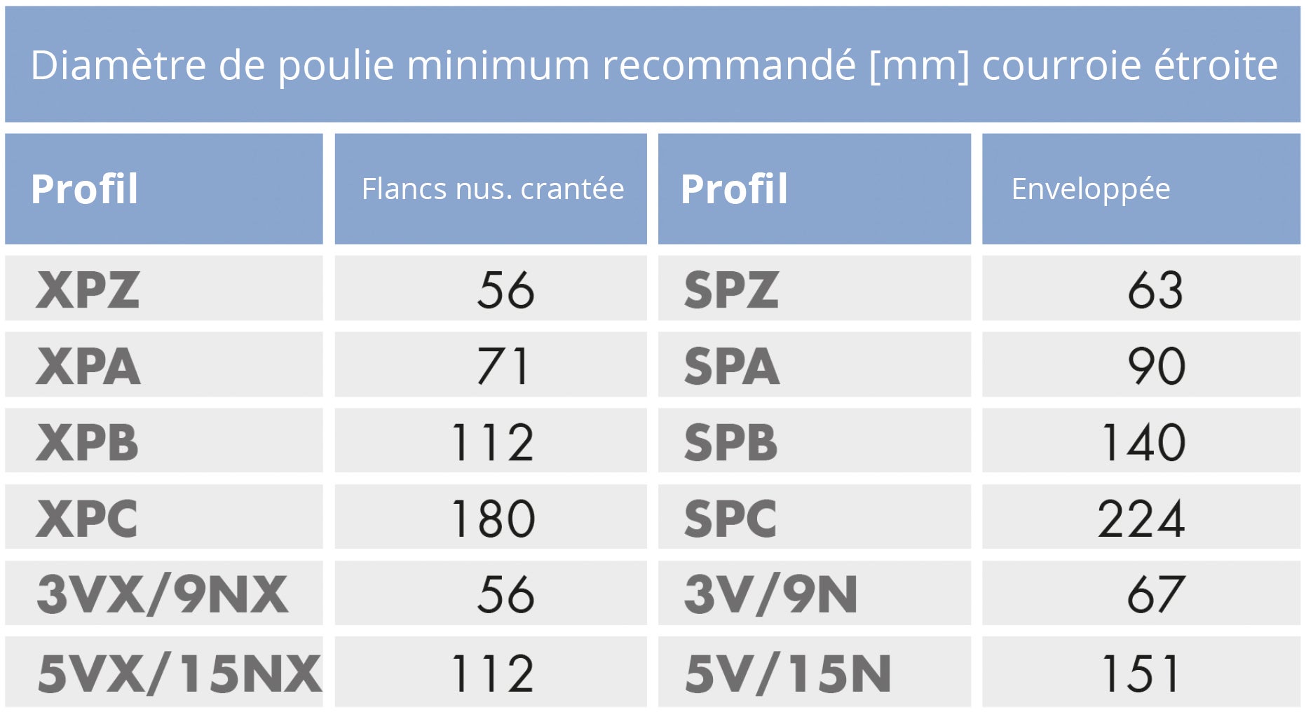 Vous pouvez identifier la courroie étroite appropriée en vous référant au diagramme et au tableau ci-dessous. Les sections transversales sont identifiées par la largeur supérieure et la profondeur.