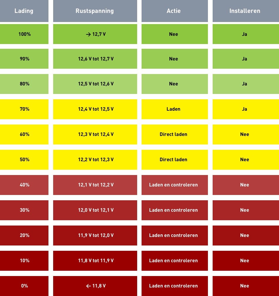 Voor het goed functioneren van een batterij is het goed om elke drie maanden de batterij te controleren met een accutester. Komt het resultaat uit onder de 12,5 V? Dan is het belangrijk dat je de batterij even oplaadt. Lees hier meer over de accutesters bij Kramp. De tabel hieronder geeft weer wat je met batterijen in je magazijn moet doen in welke situatie.