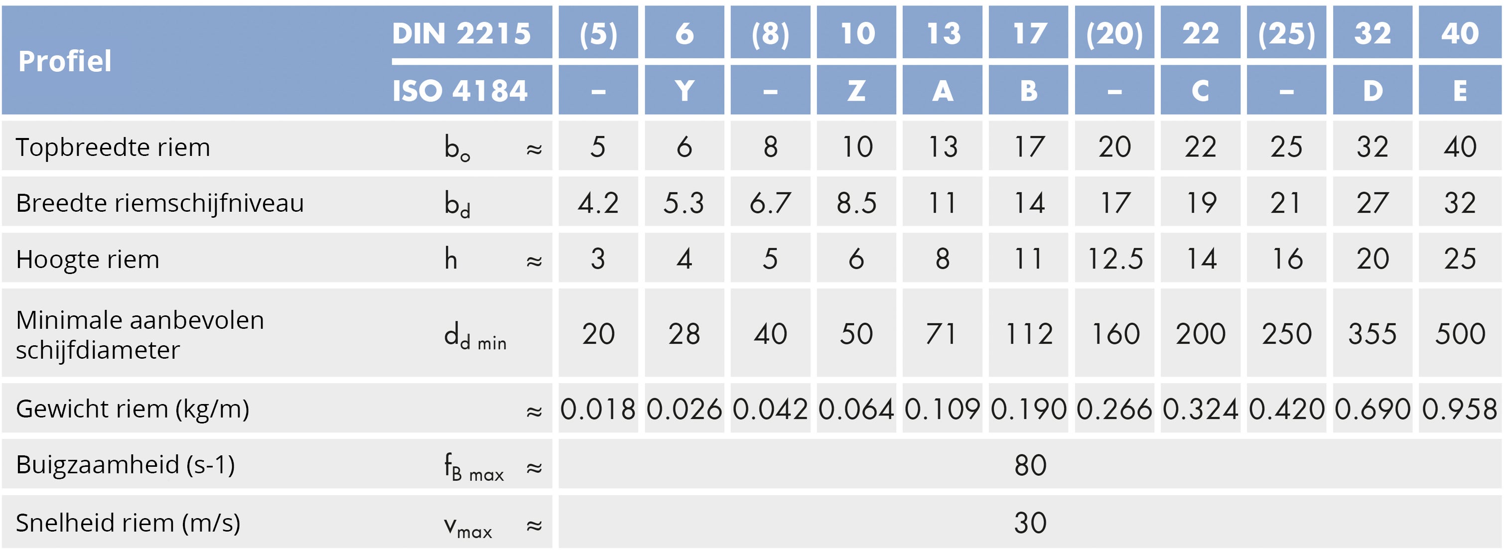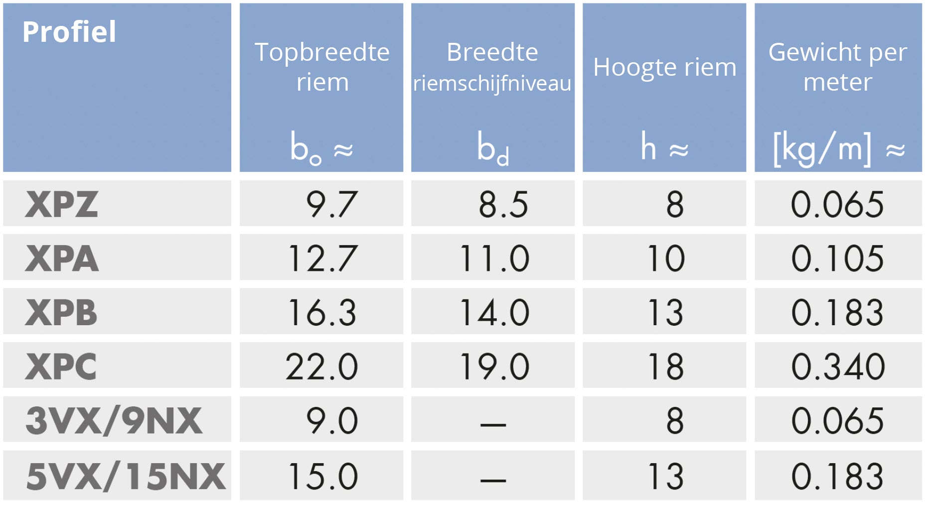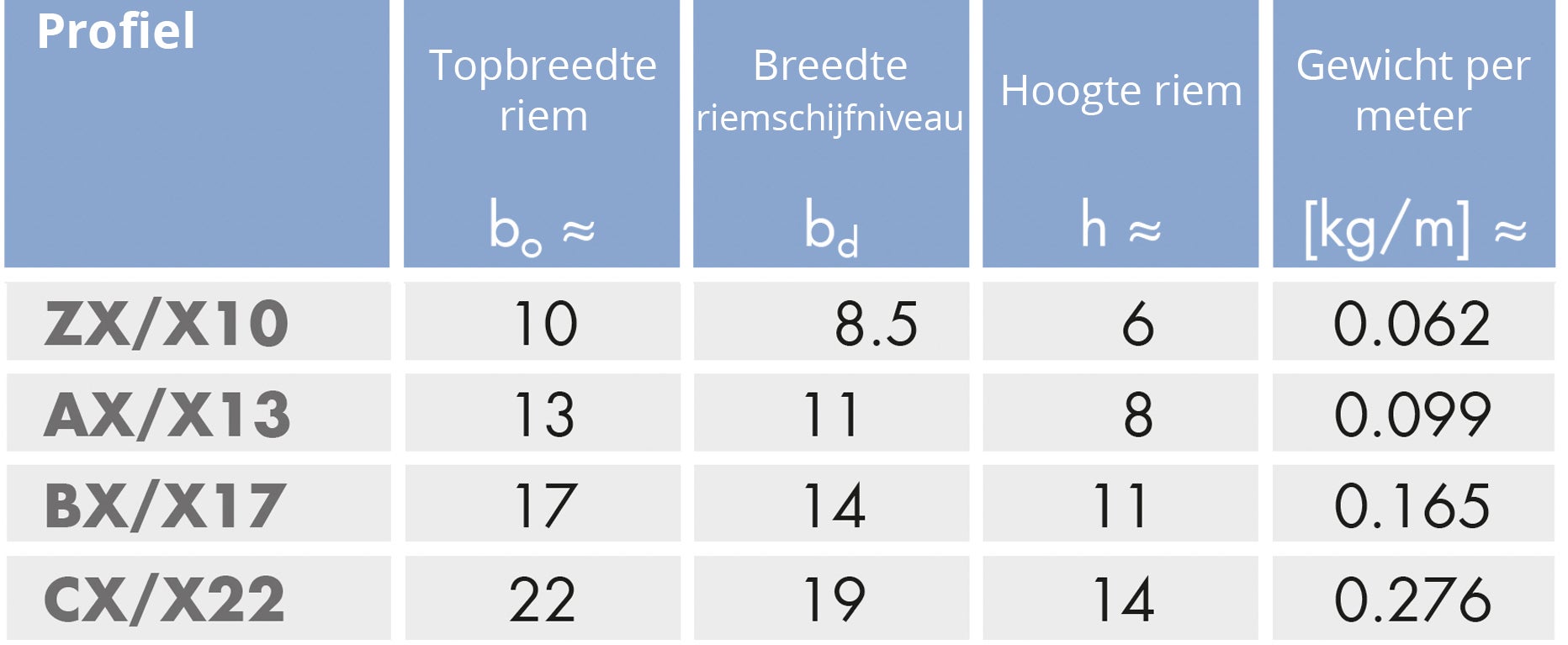 Op basis van het diagram en schema hieronder kun je bepalen welke V-riem geschikt is voor jouw toepassing. De riemen zijn te herkennen aan de hand van de topbreedte en de diepte van de doorsnede.