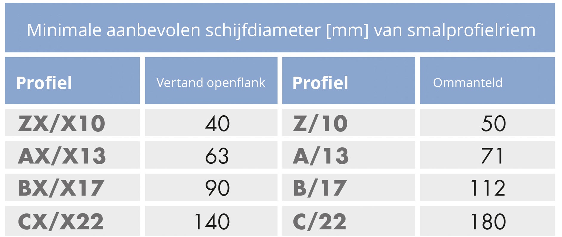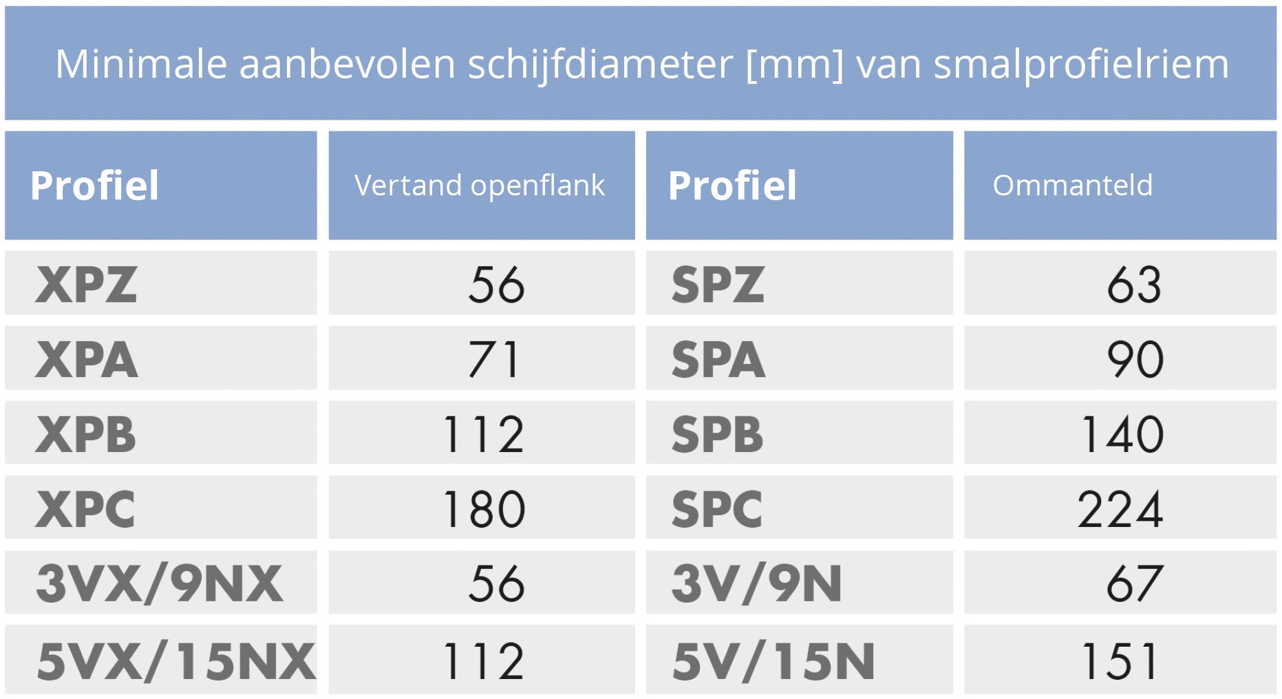 Op basis van het diagram en schema hieronder kun je bepalen welke smalprofielriem geschikt is voor jouw toepassing. De riemen zijn te herkennen aan de hand van de topbreedte en de diepte van de doorsnede.