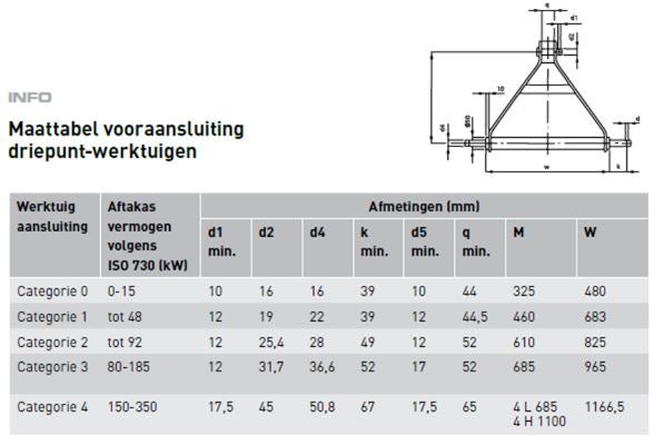 Bij de aansluitingen voor driepunts-werktuigen zijn er een 5-tal categorieën die gekoppeld zijn aan het vermogen van de tractor. Een hogere categorie heeft zwaardere hefarmen, topstangen en dikkere pennen. Waarom is dit? Simpelweg omdat hier meer kracht op komt te staan.