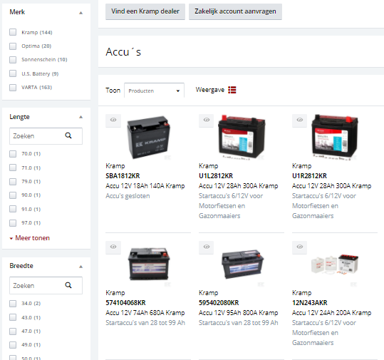 In de webshop van Kramp is een breed aanbod accu’s te vinden. Zowel van ons Kramp merk, als andere A-merken zoals Varta en Optima. Maar hoe selecteer je de juiste accu? Om dit gemakkelijker te maken zijn er zoekfilters toegevoegd aan de webshop.