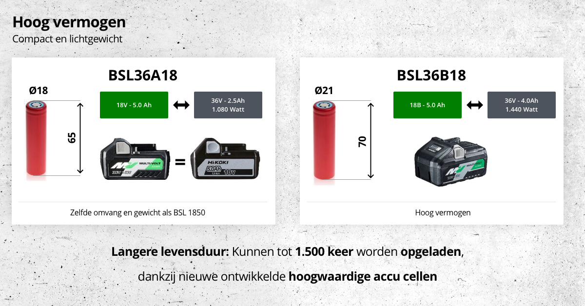 HiKOKI biedt twee verschillende versies MULTIVOLT accu's aan. Het verschil zit in de aangeboden kracht.