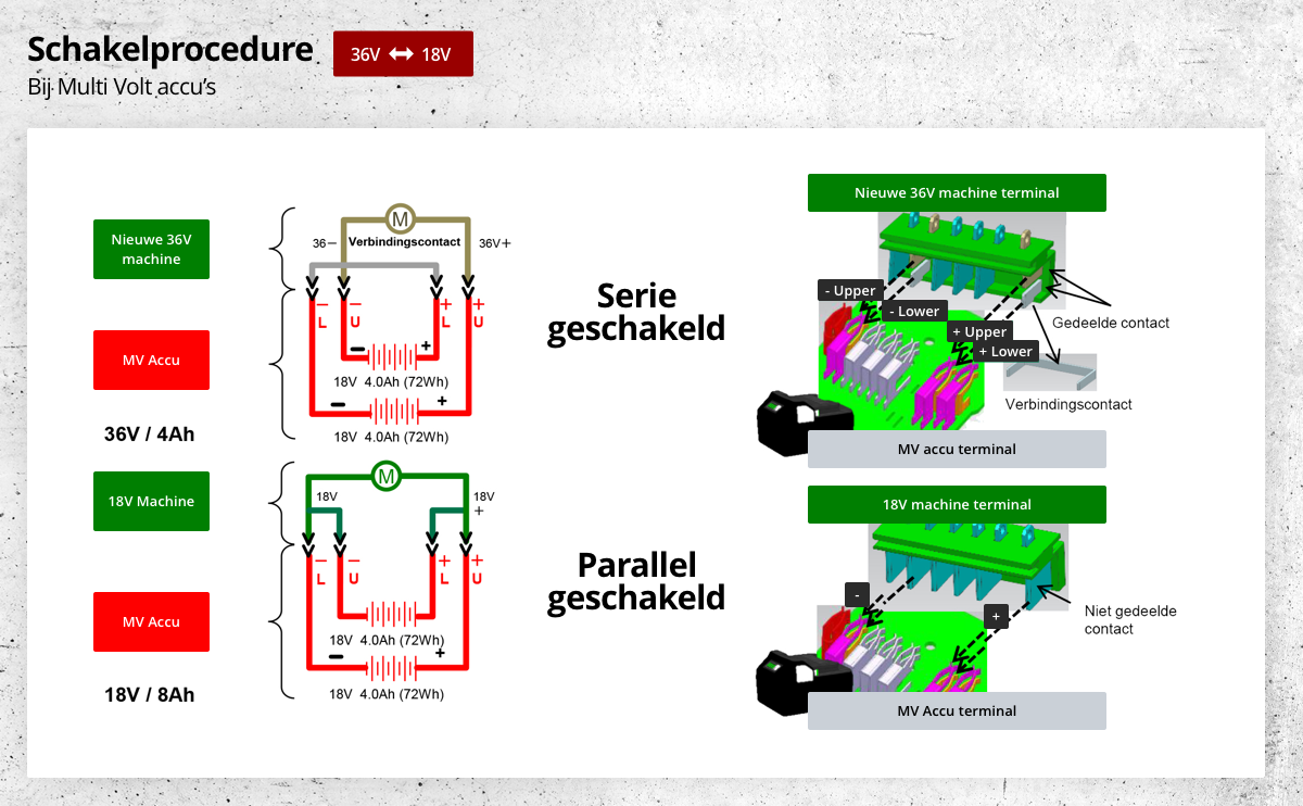 Met een MULTIVOLT accu van HiKOKI is het mogelijk. Maar hoe? Nieuwe technologieën maken het mogelijk om 36 volt accu’s in 18 volt machines te gebruiken, en andersom. De accu is parallel geschakeld in plaats in serie. De accu herkent in de machine hoeveel volt door de machine geleverd moet worden. Handig!