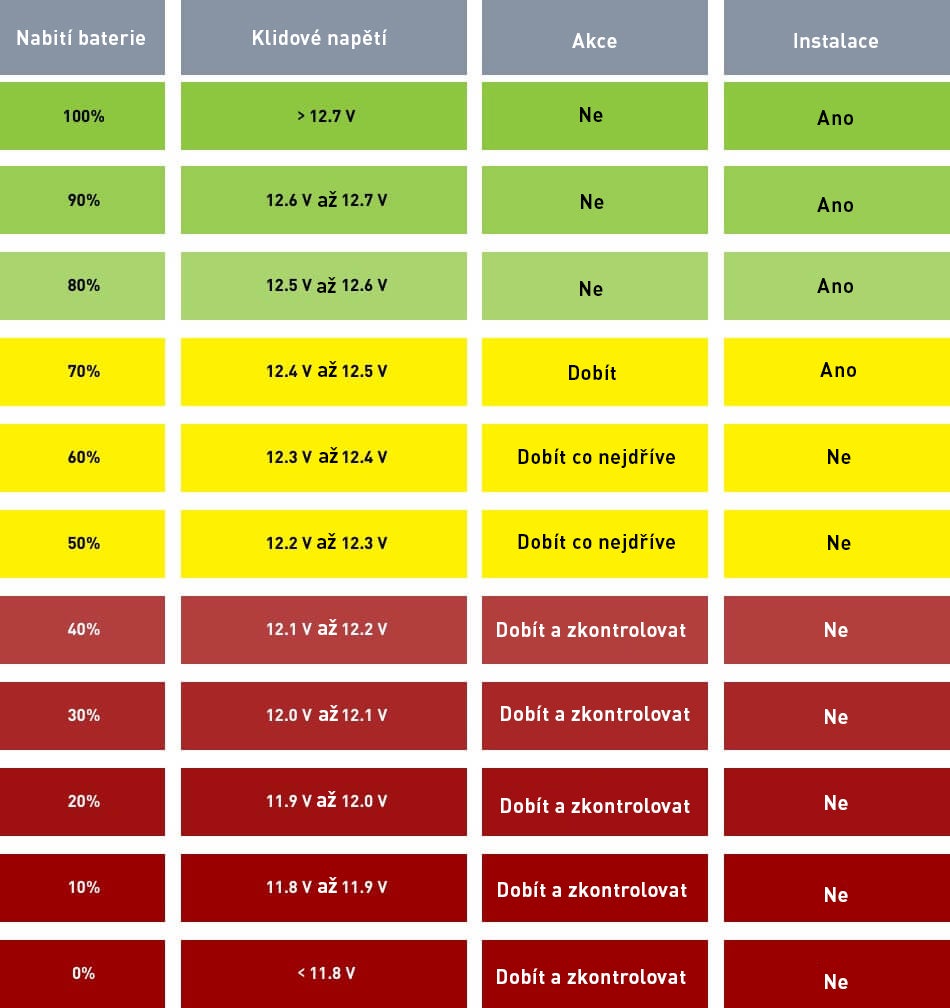 Abyste měli jistotu, že baterie bude správně fungovat vždy, když bude potřeba, doporučuje se zkontrolovat ji pomocí zkoušečky baterií, a to každé tři měsíce. Ukazuje zkoušečka hodnotu nižší než 12,5 V? V takovém případě je potřeba baterii plně nabít. Více se o zkoušečkách baterií nabízených v obchodě Kramp dozvíte zde. V tabulce níže vidíte, co dělat s uskladněnými bateriemi podle úrovně jejich nabití.