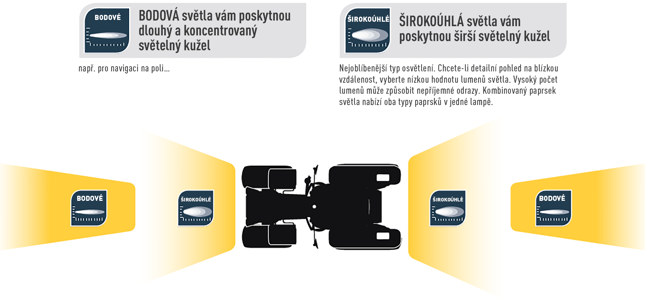 Širokoúhlé pracovní světlo, nebo také světlo se širokým kuželem, nabízí široký světelný kužel pro osvětlení velké plochy na krátkou vzdálenost. Tato lampa je velmi užitečná například tehdy, kdy požadujete dobrý výhled na pole nebo pro provoz stroje. Lampa se širokým kuželem je vhodná také pro pomalu se pohybující vozidla, protože osvětluje prostor kolem vozidla a zajišťuje tak dobrý výhled do okolí. Širokoúhlé světlomety jsou užitečné, i když kolem vozidla pracují vaši kolegové. Světlo v okolí zajišťuje zvýšenou viditelnost, a proto i vyšší bezpečnost pro vás a další pracovníky. Při určitých činnostech, jako jsou zemní práce, může být vhodné použití speciálních pracovních světel s tzv. nepřímým světlem. Tyto lampy zabraňují oslnění při práci v blízkosti světelného zdroje.