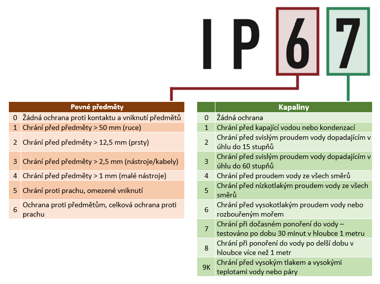 Při nákupu nového LED osvětlení a při zohlednění funkčnosti, přenositelnosti, barvy světla a světelného obrazu je vždy důležitá volba té správné hodnoty IP. Hodnota IP znamená „stupeň krytí“. Jedná se o univerzální normu pro označení úrovně ochrany proti vniknutí pevných předmětů a kapalin do elektrických zařízení.