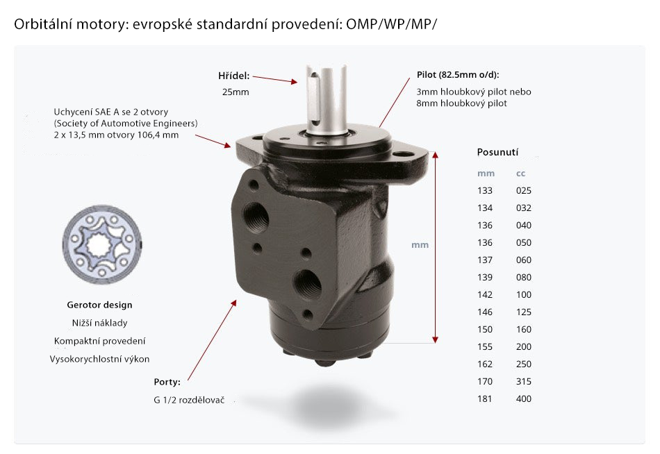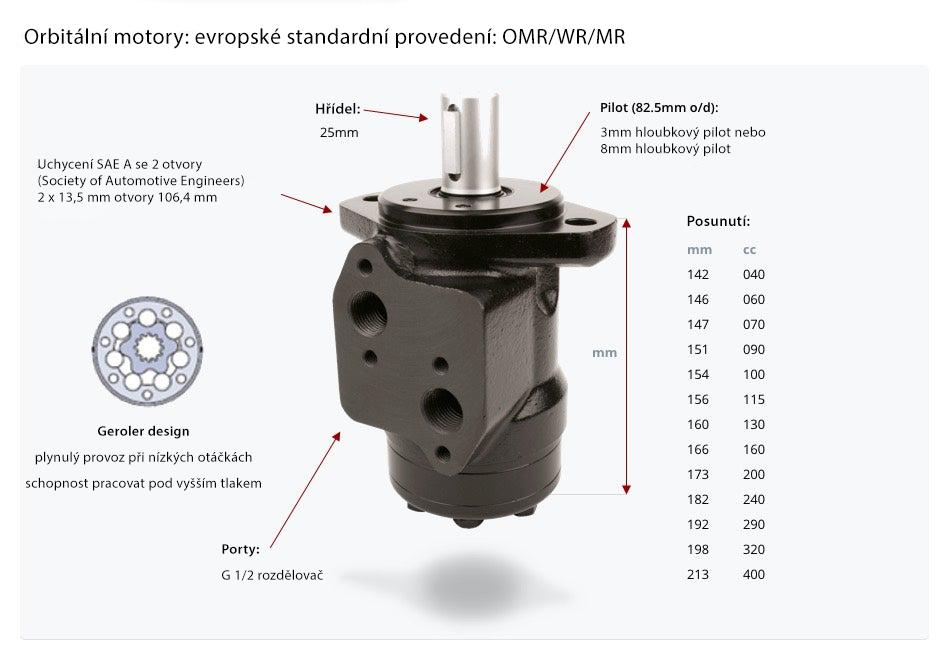 Orbitální motor typu „P“ využívá konstrukci typu gerotorOrbitální motory typu „P“ a „R“