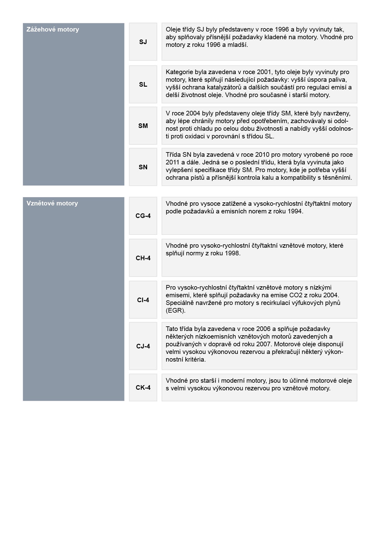 - Označení „S“ zahrnuje kategorie olejů pro zážehové motory