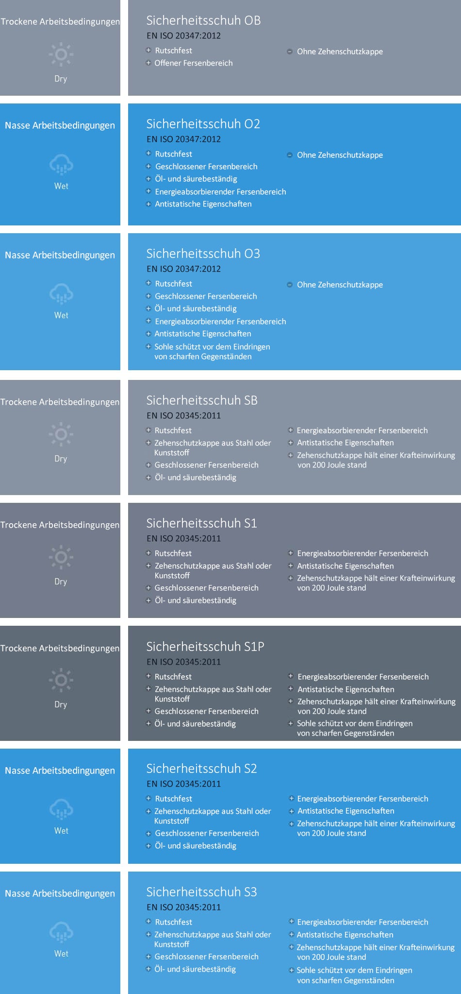 Wir haben die wichtigsten Sicherheitsstandards in einer Übersicht zusammengestellt. Nutzen Sie die Tabelle, um den Schuh auszuwählen, der genau auf Ihre Bedürfnisse zugeschnitten ist und alle Eigenschaften hat, um Ihnen ein sicheres und komfortables Arbeiten zu ermöglichen.