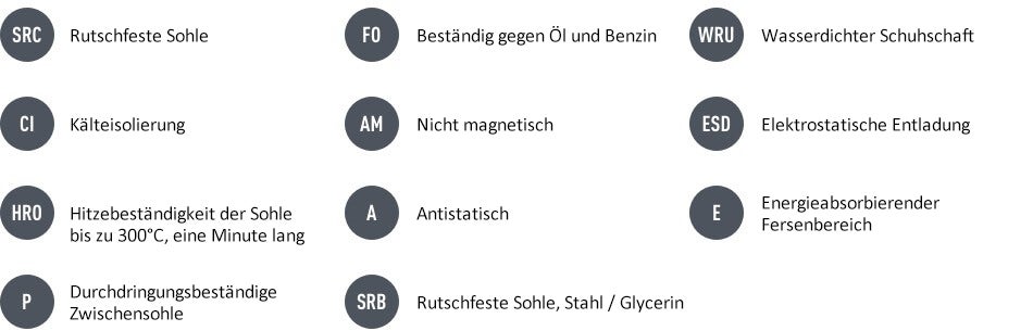 Die folgenden zusätzlichen Angaben in der Produktbeschreibung helfen Ihnen, Sicherheitsschuhe zu finden, die für Ihre Arbeitsumgebung perfekt sind.