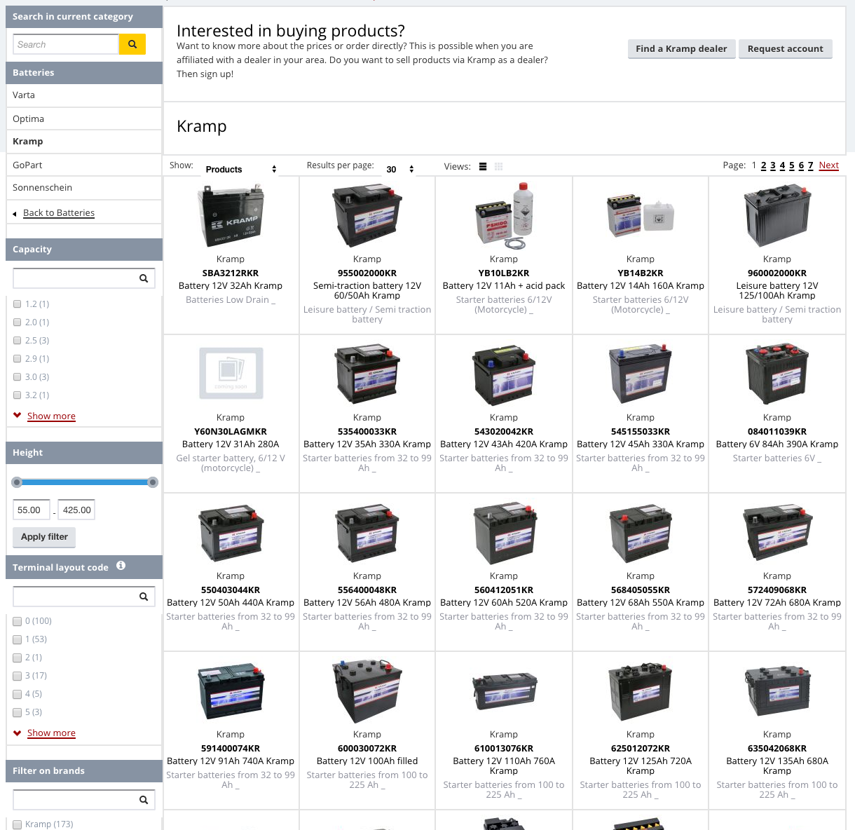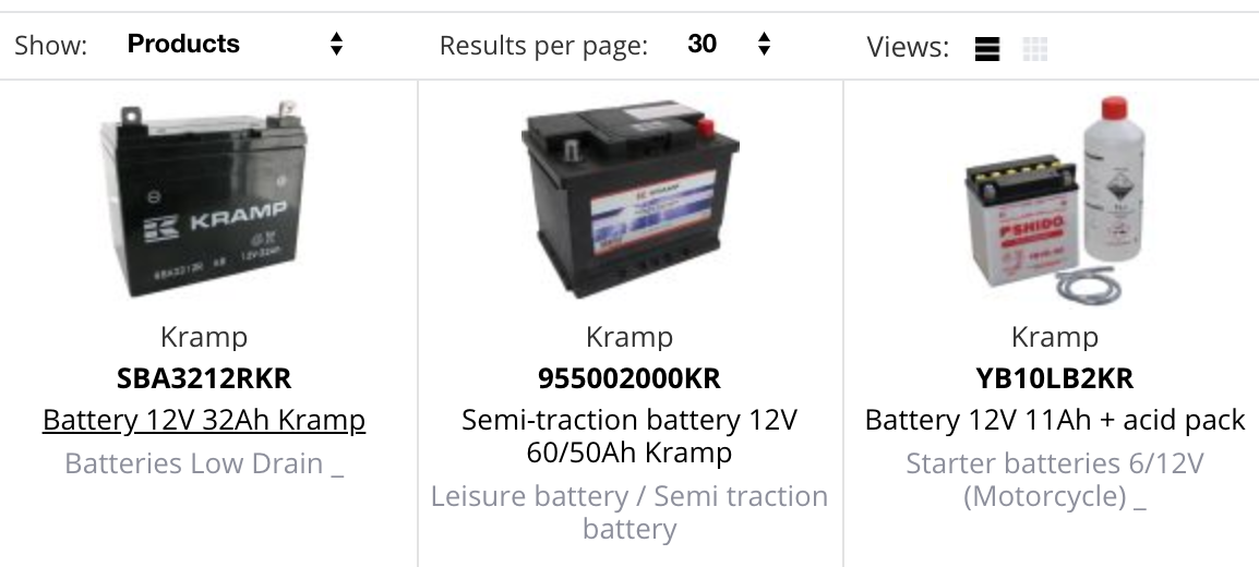 Um die Filter zu nutzen, gehen Sie einfach über das Menü „Traktoren & Fahrzeuge“ zur Übersichtsseite „Batterien & Zubehör“ im Kramp Webshop. Wählen Sie unter Anzeigen „Produkte“ aus, um die Filteroptionen anzuzeigen. Nach der Wahl der gewünschten Batterie wechseln Sie bitte wieder unter Anzeigen zu „Produktgruppenansicht“.