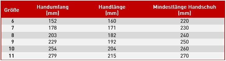 Neben der richtigen Risikokategorie ist es wichtig, auf die richtige Handschuhgröße zu achten. Die Verwendung zu großer Handschuhe kann das Unfallrisiko erhöhen. Das Größensystem in der folgenden Tabelle basiert auf der Handgröße, d. h. auf dem Umfang und der Länge der Hand.