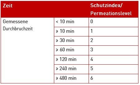 den einzigen Handschuh, der vor allen Flüssigkeiten schützt. Vielmehr muss von Fall zu Fall das optimale Produkt ermittelt werden. Ein vollwertiger Chemikalienschutz erreicht bei mindestens 3 von 12 gesetzlich festgelegten Prüfchemikalien einen Schutzindex von mindestens Klasse 2, d. h. eine Permeationszeit > 30 Minuten (Permeation = Durchdringung auf molekularer Ebene).