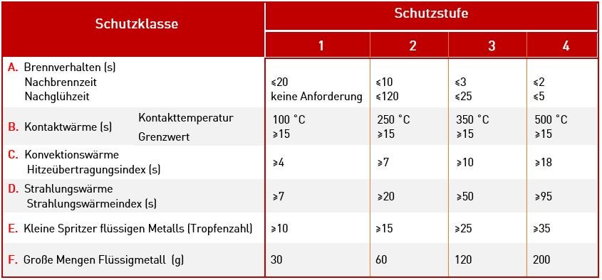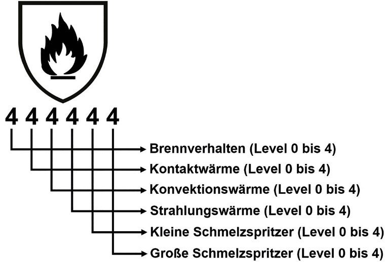 - Brennverhalten Um das Brennverhalten eines Schutzhandschuhs zu testen, wird das Handschuhmaterial 15 Sekunden lang einer Gasflamme ausgesetzt und anschließend gemessen, wie lange es dauert bis es aufhört zu brennen. Hierbei dienen sowohl die Nachbrennzeit als auch die Nachglühzeit (beides in Sekunden) als Messindikatoren zur Einstufung des Handschuhs. Besteht die Gefahr, dass der Handschuh mit Feuer in Berührung kommt, muss er mindestens die Stufe 3 erreichen.