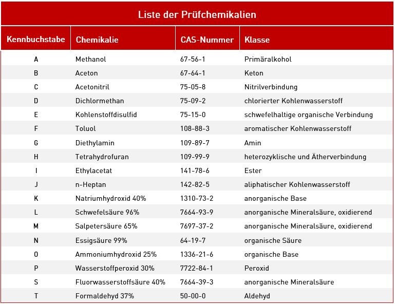 Ein Handschuh gilt als chemikalienbeständig, wenn ein Schutzindex von mindestens Klasse 2 (d. h. ≥ 30 Minuten) bei drei der Prüfchemikalien aus nachstehender Tabelle erreicht wird.