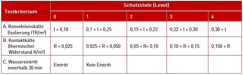 (A) durchdringende oder konvektive Kälte und (B) Kontaktkälte, d. h. direkter Kontakt mit kalten Gegenständen. Die Prüfung der Wasserdichtheit (C) wird durchgeführt, wenn dies relevant ist. Hier gibt es zwei Bewertungen: 0 und 1. Wenn nach 30 Minuten kein Wasser eingedrungen ist, wird der Handschuh mit einer 1 als letzte Zahl gekennzeichnet. Ansonsten ist die Bewertung 0.