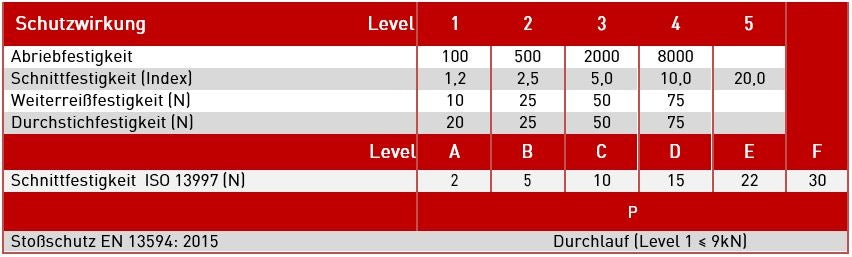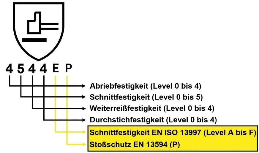 Ein Handschuh gilt als "Schutzhandschuh gegen mechanische Risiken", wenn er mindestens in einer der ersten Ziffern einen Schutzlevel größer als Null erreicht hat. Bei der Kennung "0000" wäre es somit kein Schutzhandschuh gegen mechanische Risiken. Wenn einer der Leistungstests nicht durchgeführt wurde, wird das fehlende Testergebnis im Zahlencode durch ein "X" ersetzt.