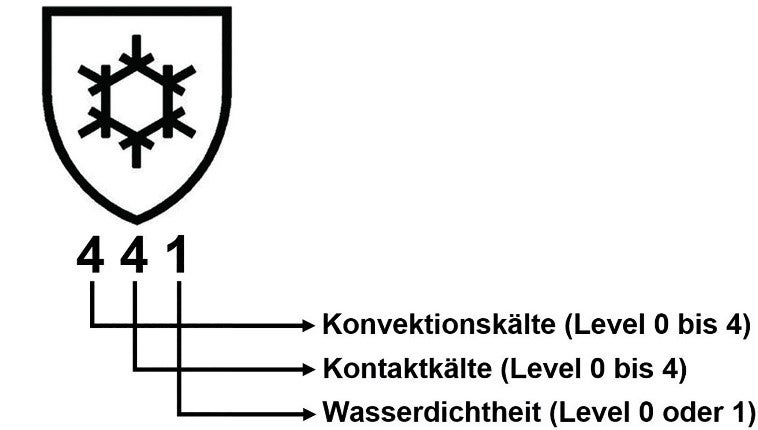 Das Kristall-Piktogramm darf nur für Handschuhe verwendet werden, die mindestens Leistungsklasse 1 für Konvektionskälte oder Kontaktkälte erreicht haben. Ein X bedeutet, dass es nicht relevant ist, den Handschuh auf Wasserdichtheit zu prüfen. Alle Handschuhe müssen mindestens Leistungsklasse 1 für Abriebfestigkeit und Weiterreißfestigkeit nach EN 388 erreichen. Bei extremer Kälte sind die Anforderungen an die mechanische Beständigkeit strenger. Ab Stufe 2 müssen die Handschuhe mindestens die Leistungsklasse 2 für Abriebfestigkeit und Weiterreißfestigkeit erreichen.