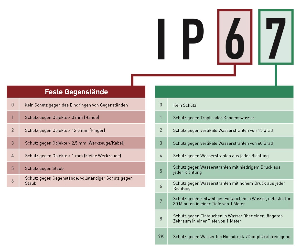 Die erste Zahl gibt an, inwieweit die Lampe gegen das Eindringen von festen Substanzen oder Objekten geschützt ist. Zahlen von 0 bis 6 sind möglich, wobei 0 die niedrigste und 6 die höchste ist.