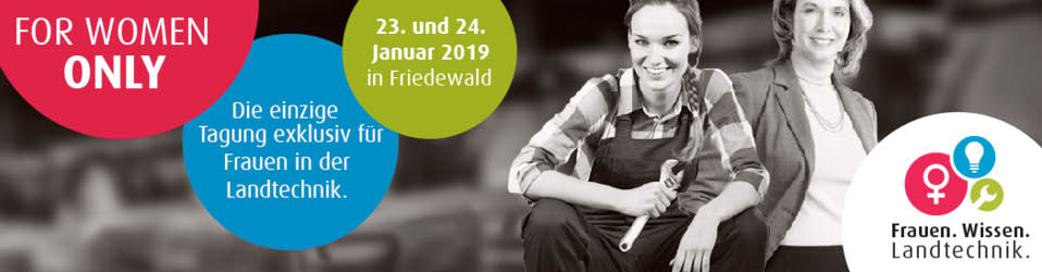Weiblich? Landtechnikverliebt? Wissenshungrig? Dann sind Sie im Januar auf der Tagung "Frauen.Wissen.Landtechnik." genau richtig! Am 23. und 24. Januar 2019 feiert die Veranstaltung bereits Ihren fünften Geburtstag. Interessierte Damen aus der Landtechnik-, Motoristen- und Baubranche sind dazu herzlich eingeladen.