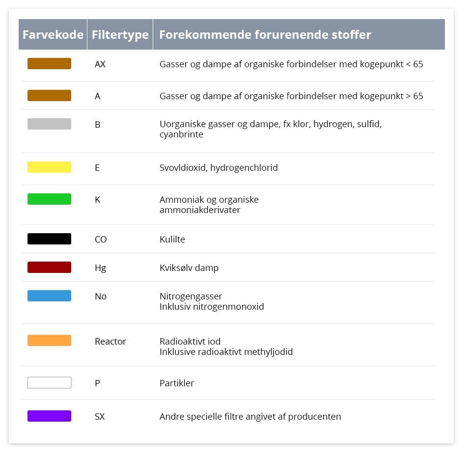Den følgende tabel viser farvekodningen af filtre i henhold til EN14387 - dette hjælper dig med at afgøre, hvilken type filter der kræves for den farlige substans, du arbejder med.