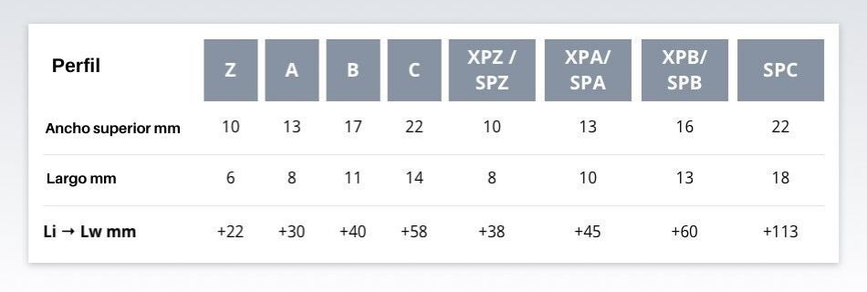 En este gráfico puede ver las diferentes longitudes y las medidas de ancho disponiblesMedición de correas trapezoidales