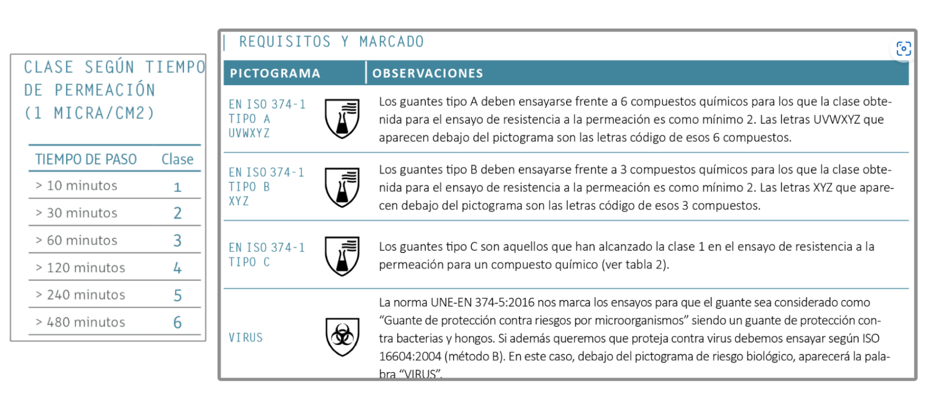 La norma EN ISO 374:2016 comprueba el tiempo que tardan ciertos productos químicos y microorganismos en penetrar en los guantes. Según este criterio de permeación hay 3 tipos.