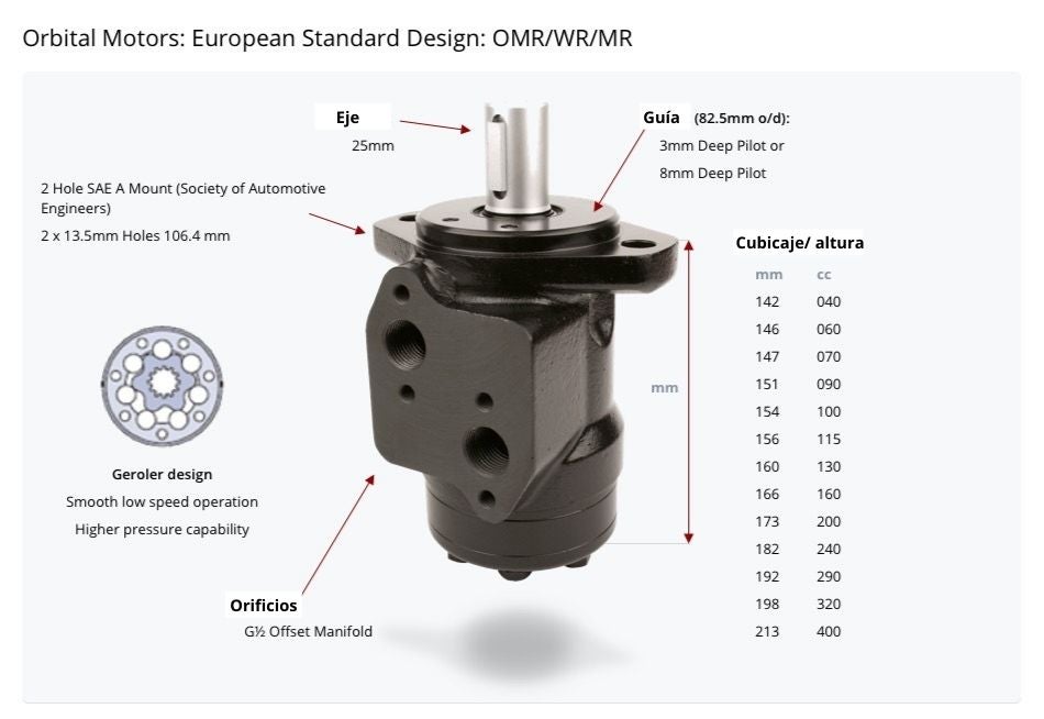 El “P” usa el diseño gerotorEl "R", en cambio, utiliza la rueda dentada del geroler, que está diseñada para presiones más altas que el "P" y para un funcionamiento más suave a baja velocidad.