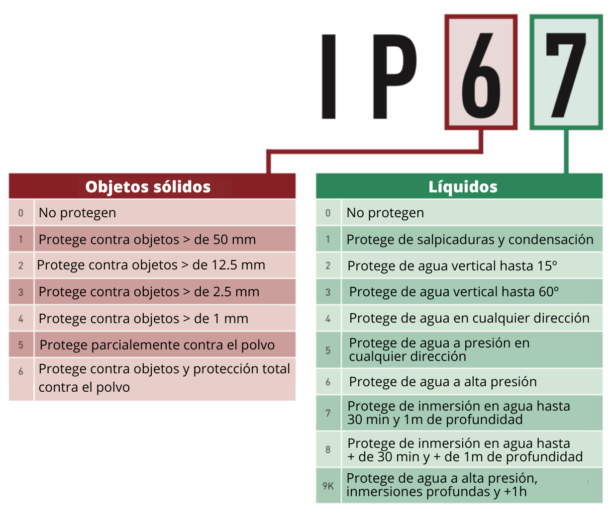 * El primer número indica hasta qué punto la lámpara está protegida contra la entrada de objetos sólidos. Este número va de 0 a 6, siendo 0 el más bajo y 6 el más alto.