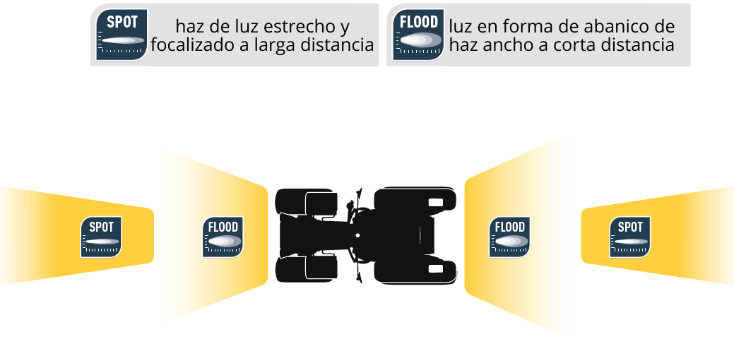 Proporciona un haz de luz estrecho en una distancia relativamente grande. Es perfecta cuando se necesita ver a gran distancia en el campo y también es adecuada para los vehículos que circulan a mayor velocidad, ya que los obstáculos se pueden ver antes en la distancia.