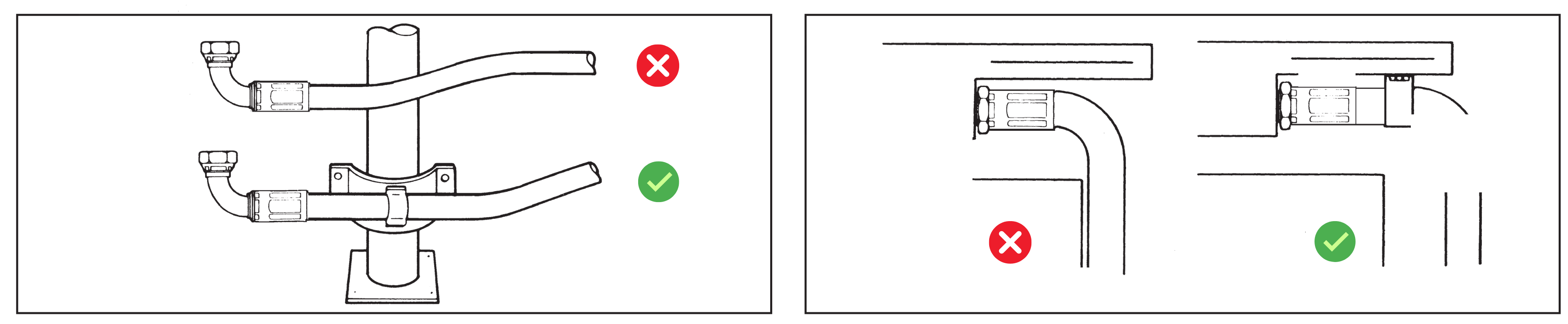 Evitar dobrar diretamente atrás das peças de ligação. Mangueiras diferentes estão sujeitas a diferentes graus de pressão, por isso não dobrar ou juntar linhas de alta e baixa pressão.