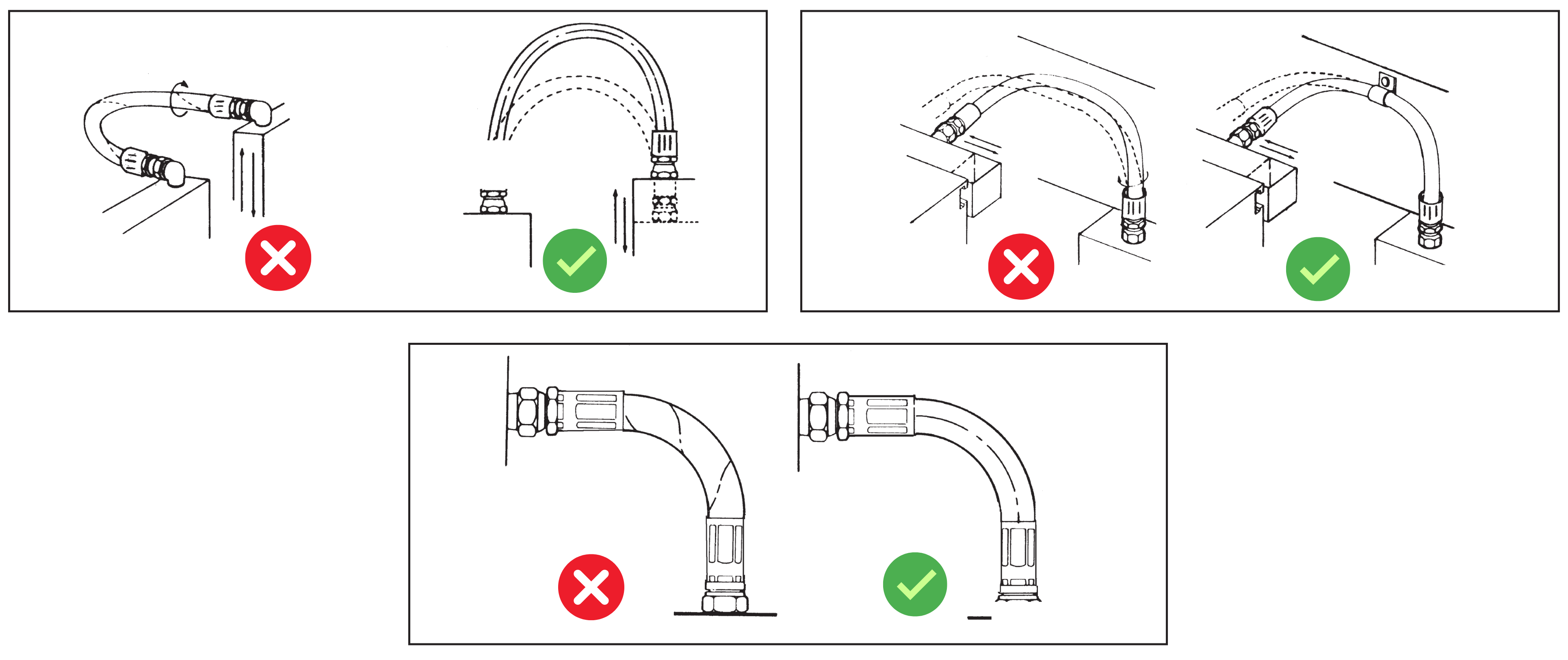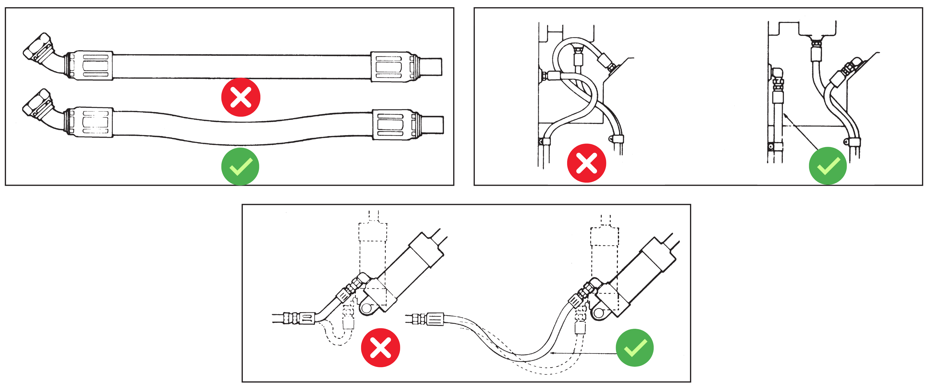 Deve evitar-se o desgaste, o esmagamento e um raio de curvatura demasiado baixo. O comprimento deve ser suficientemente longo para compensar o movimento de quaisquer peças móveis ligadas à mangueira.