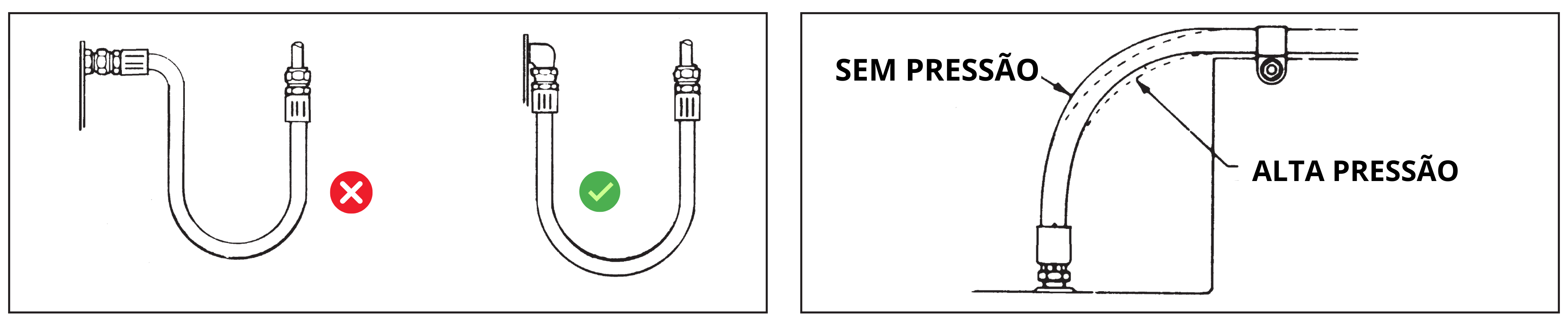 As alterações de comprimento que ocorrem sob pressão exigem que a mangueira tenha um comprimento extra. É importante utilizar uniões angulares e suportes de tubos que garantam uma boa orientação para o comprimento extra da mangueira.