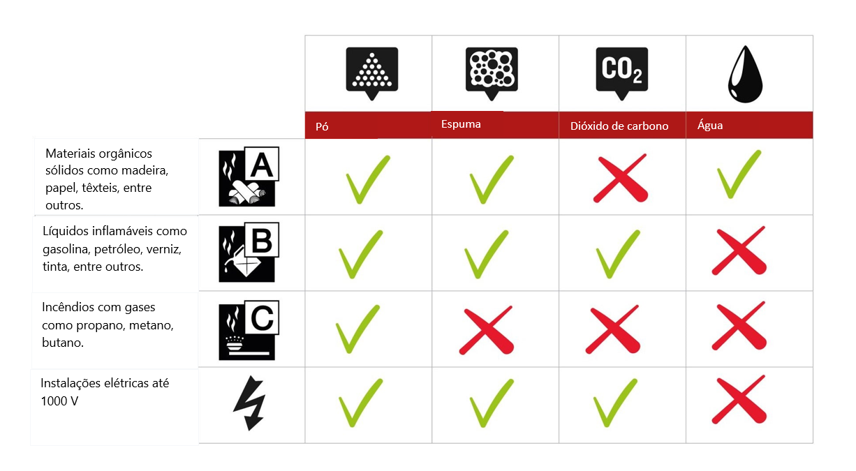 Todos os extintores são aprovados para uma ou mais classe de incêndio, de acordo com a aplicação do extintor. A classe de incêndio indica o tipo de incêndio que pode extinguir. Tenha em atenção o seguinte.