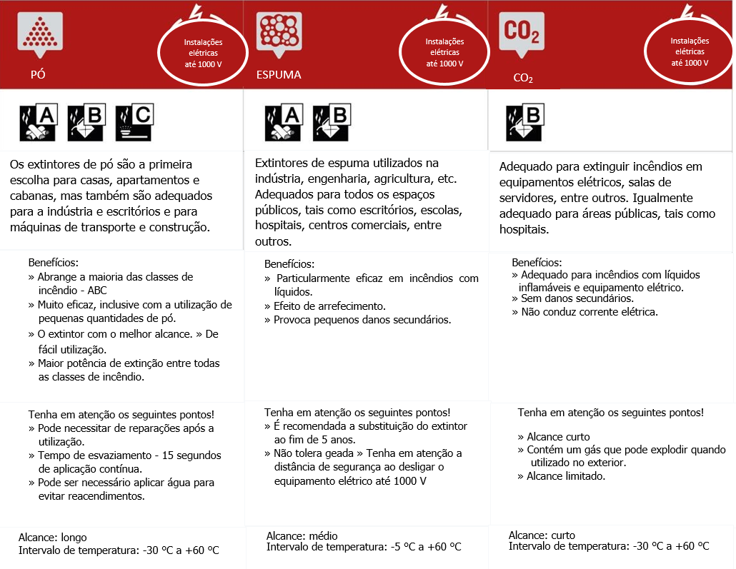 Existem diferentes tamanhos e tipos de extintores. São adaptados a diferentes situações e ambientes, dependendo do tipo de incêndio que é provável ocorrer ou do tipo de exploração agrícola onde pode vir a ser utilizado. Pode consultar os benefícios de cada um abaixo.