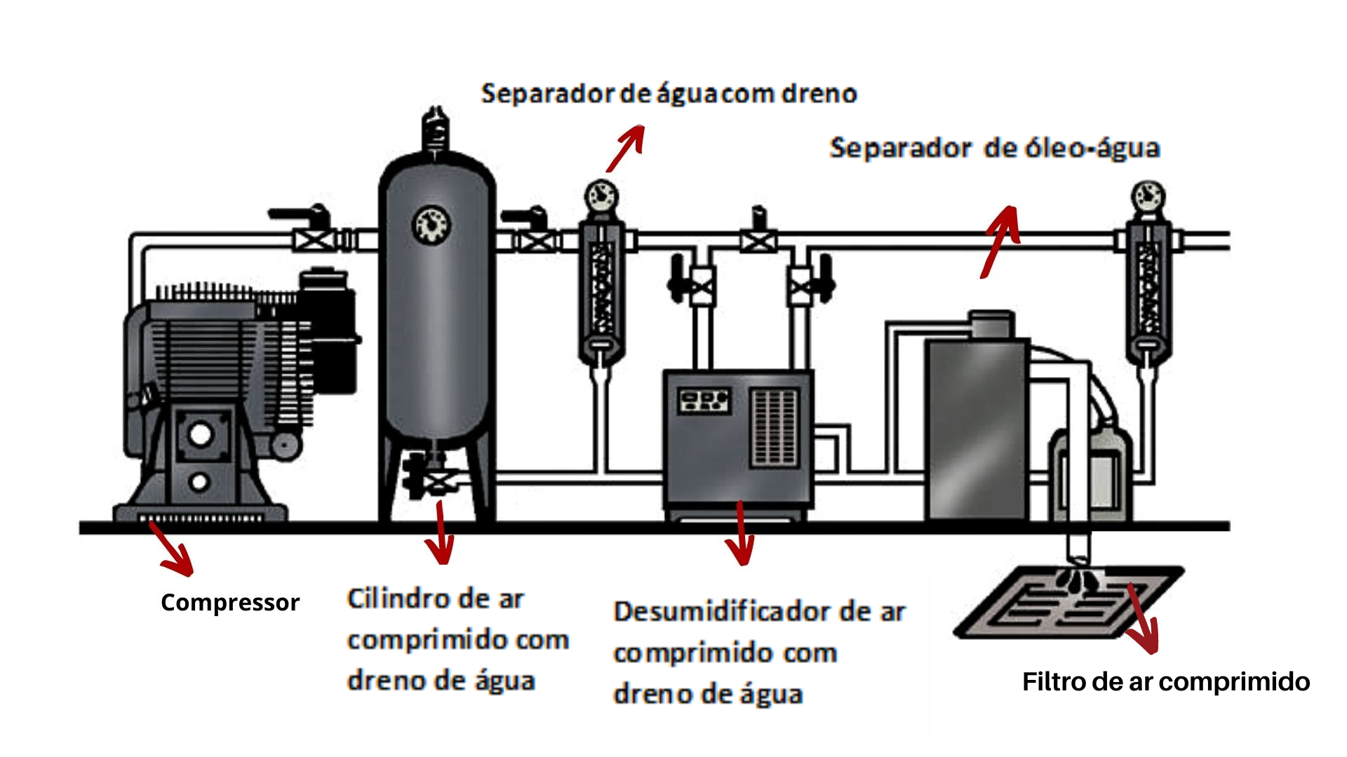 Um compressor comprime o ar comprimido e armazena-o num cilindro. Entre outras coisas, o compressor aspira detritos e humidade do ar exterior. Nem toda a gente tem bem a noção das consequências disto. O ar armazenado no cilindro condensa. Muitas vezes as pessoas esquecem-se de drenar a água resultante. Demasiada água origina, por exemplo, ferrugem. Para evitar esta situação, ou outras formas de danos, utilize um dreno (automático) de condensados. Este é utilizado para drenar a condensação existente no fundo do cilindro.