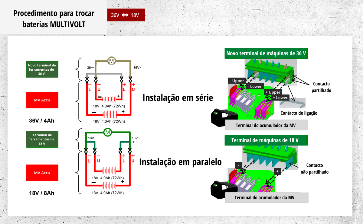 - Já não precisa de outro tipo de bateria. Pode trabalhar com ferramentas de 18 e 36 Volts com uma só bateria. Isto significa que pode poupar dinheiro de imediato, pois não é necessário comprar dois tipos diferentes de baterias.