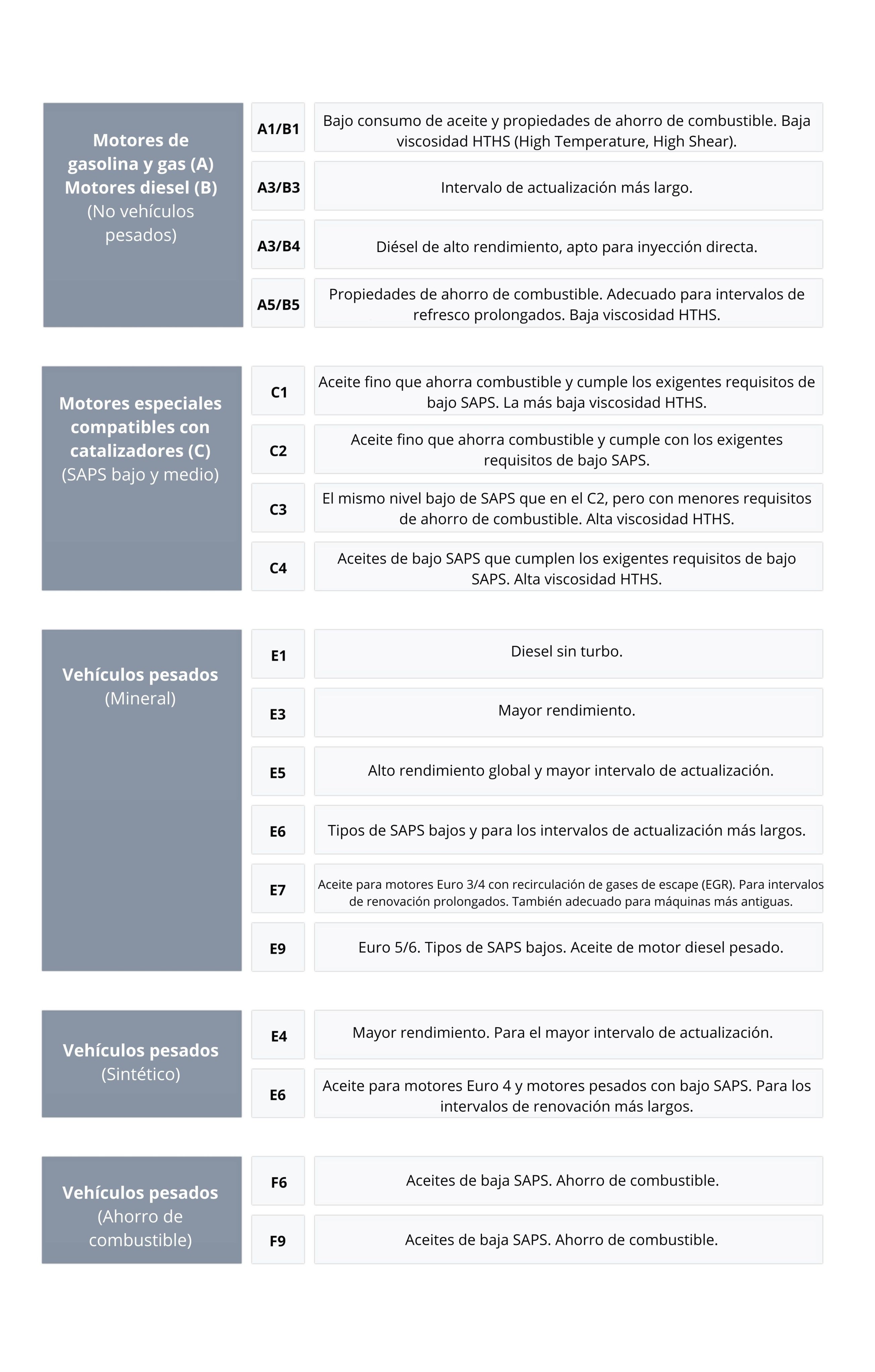 Uma importante especificação de óleo é a especificação ACEA, que consiste de uma letra e um número. Com esta especificação, é feita a seguinte distinção: