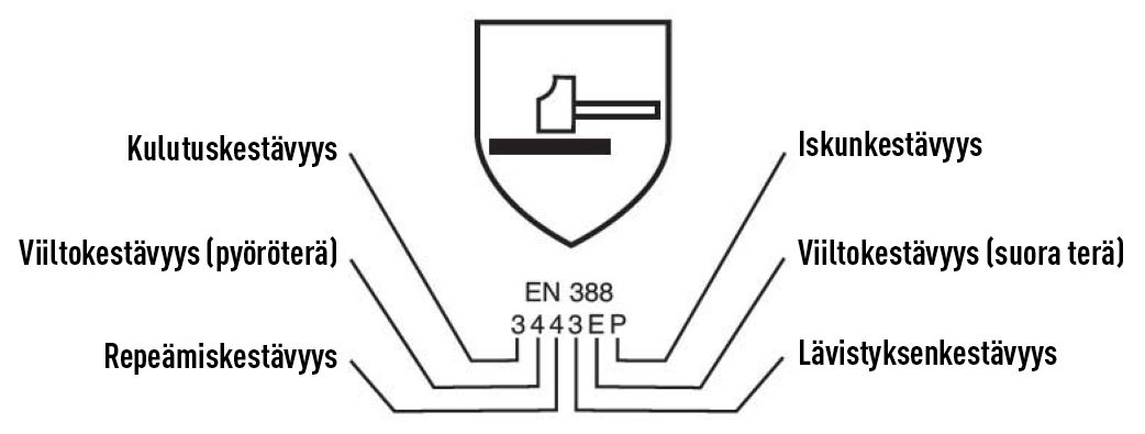 Standardi EN-388: 2016 takaa tuotteiden ja palveluiden turvallisuuden ja laadun. Työkäsineiden on oltava näiden standardien mukaisia ja niiden kulutuksen, viiltojen (2x), repeämisen, puhkaisun ja iskujen kestävyys on testattu, jotta voit määrittää, miltä käsineet sinua suojaavat ja missä määrin.